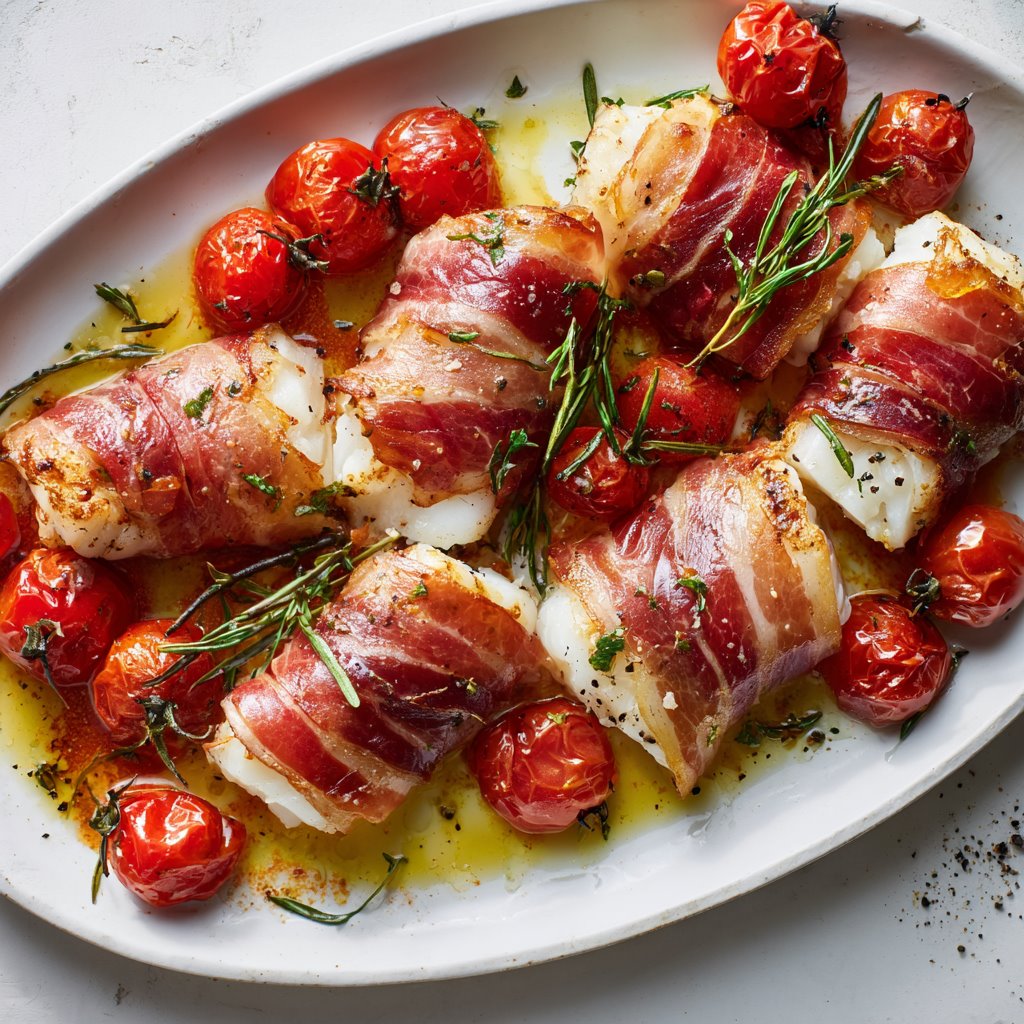 This baked cod wrapped in prosciutto is a simple yet elegant dish that delivers big flavor with minimal effort. The salty prosciutto pairs beautifully with tender, flaky cod and juicy roasted tomatoes.