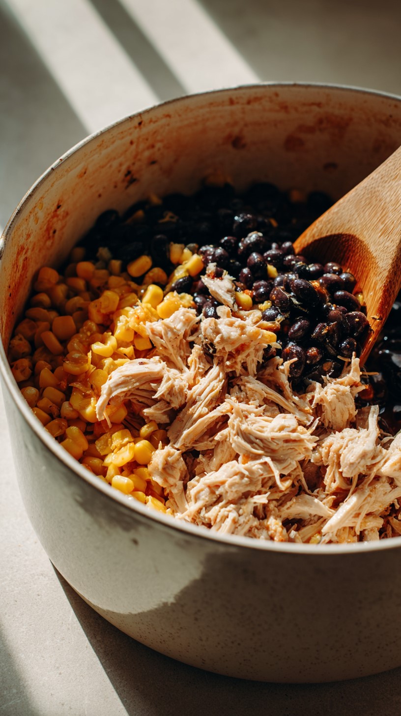 Stir in shredded chicken, black beans, frozen corn, chicken broth, and the remaining seasoning blend.