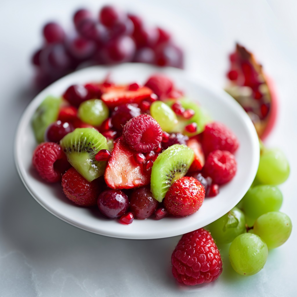 Bright, juicy, and naturally sweet — this simple fruit salad is tossed with maple syrup and fresh lemon juice, then finished with pomegranate seeds for a pop of color and crunch.