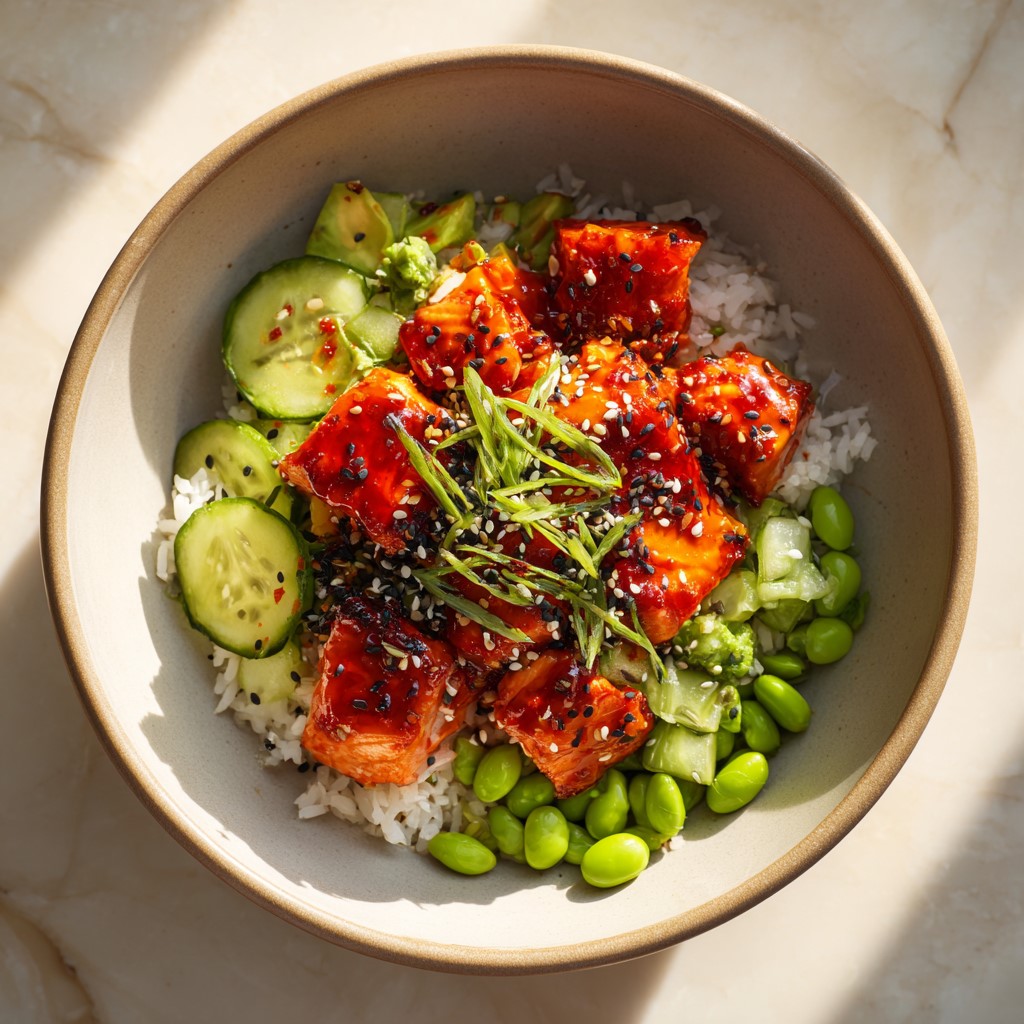 - Assemble bowls with rice, edamame, cucumber, avocado, and salmon.