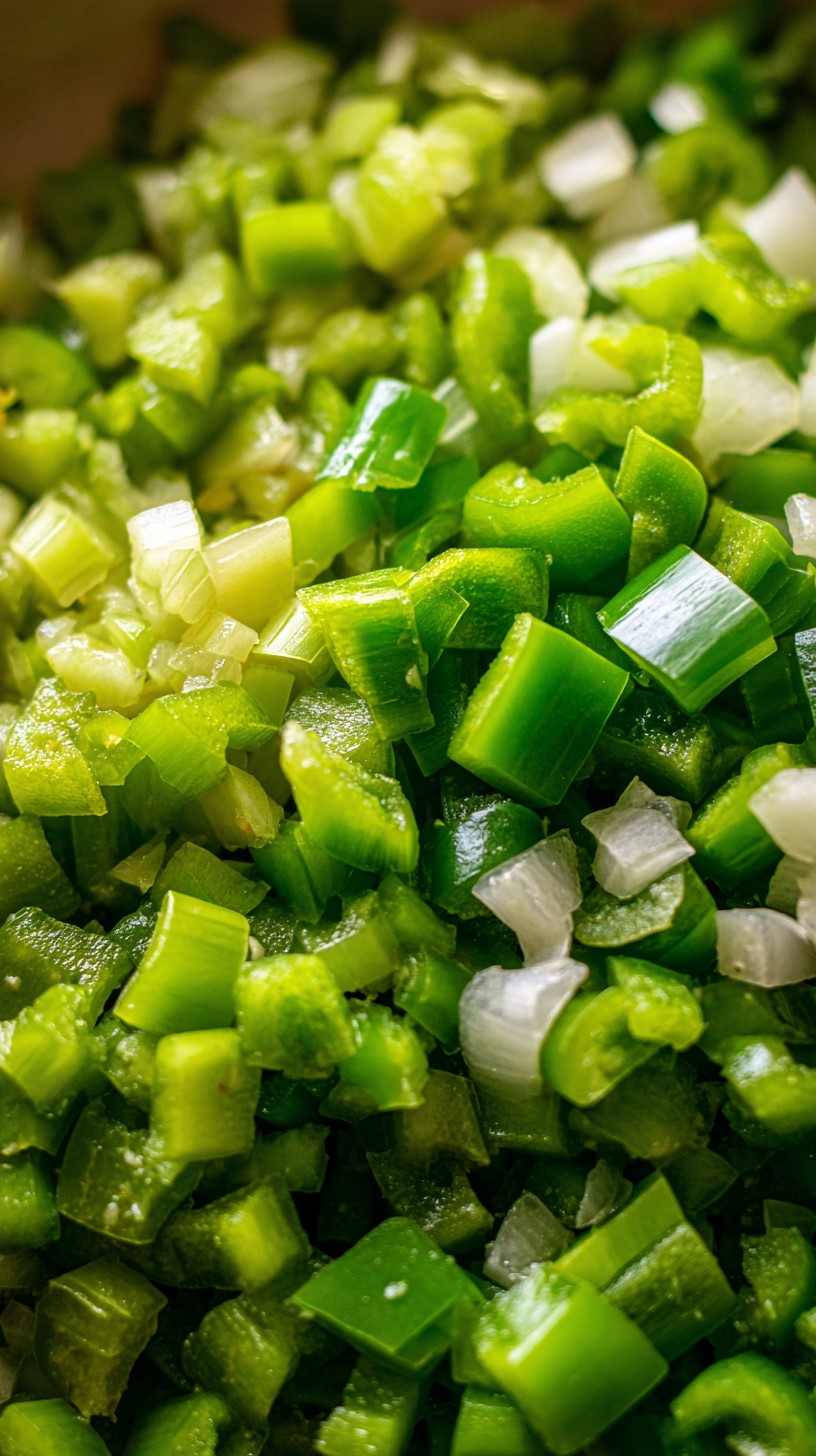 Onion, green bell pepper, and celery—often called the “holy trinity” of Cajun cooking—form the aromatic foundation of the dish.