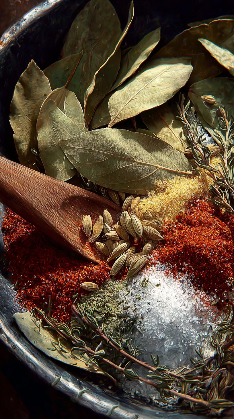 Spices like thyme, cayenne, and bay leaves enhance the dish with warmth and depth.