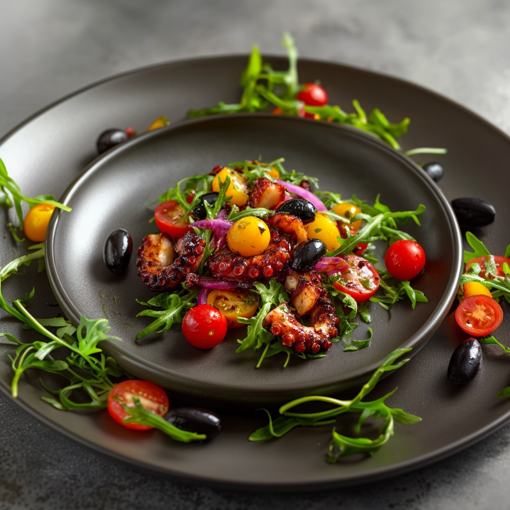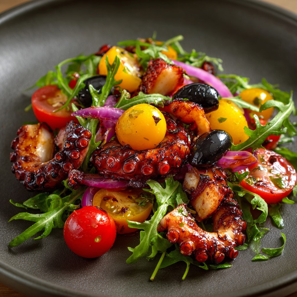 This pulpo salad combines tender octopus with fresh vegetables, briny olives, and a zesty lemon dressing for the perfect Mediterranean-inspired dish.