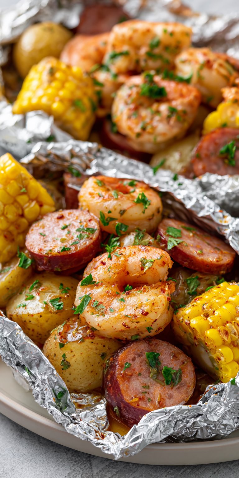 This recipe brings together shrimp, sausage, corn, and potatoes in one convenient packet.