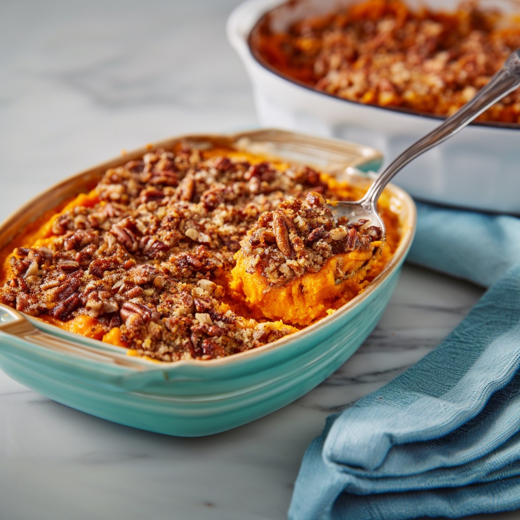 There’s something so comforting about a sweet potato casserole that’s creamy, spiced, and topped with a crunchy pecan crumble.